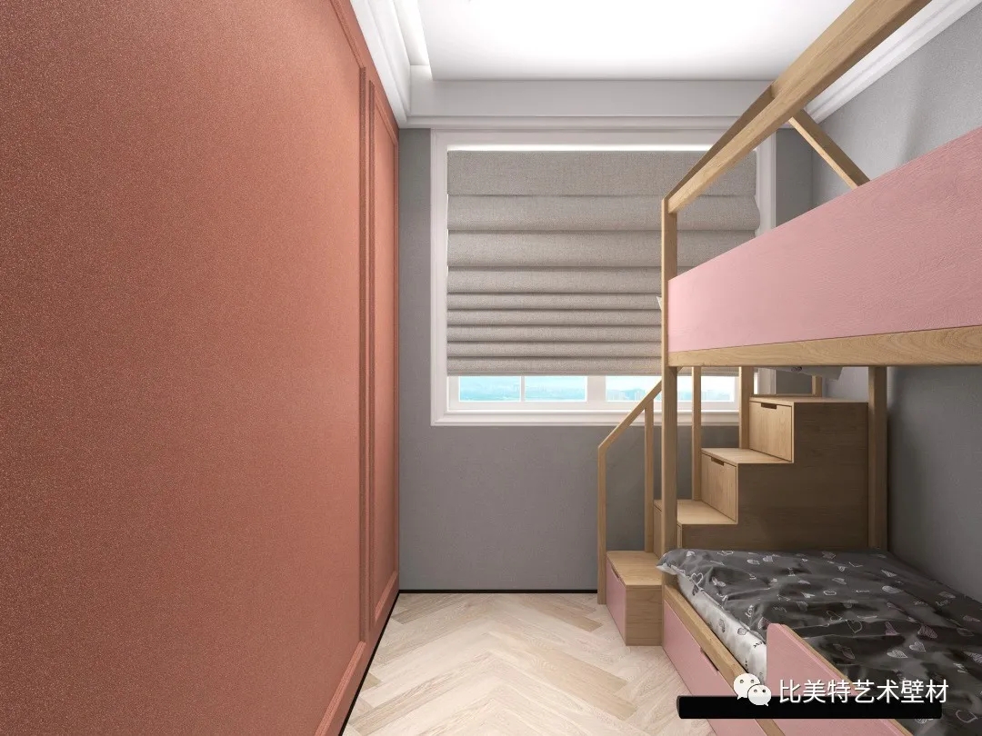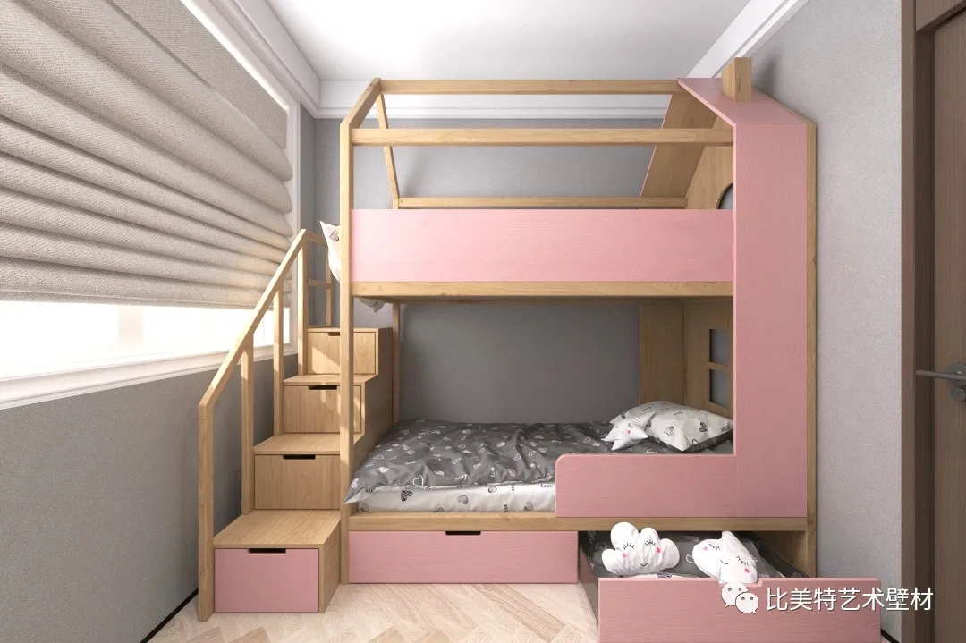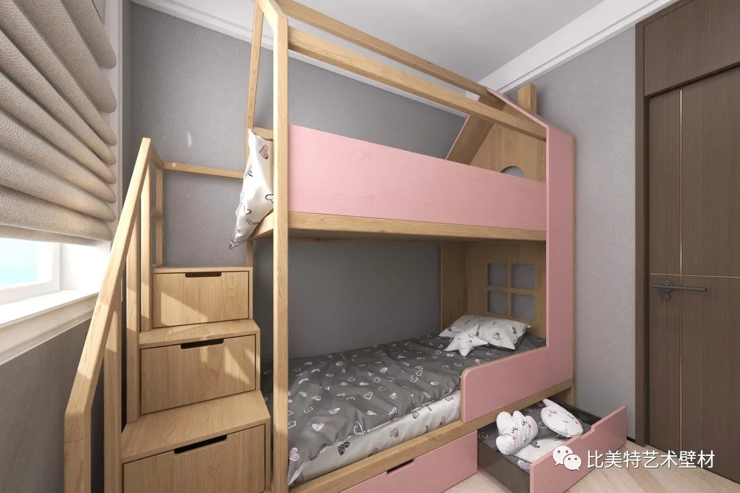 儿童房墙面选用克瑞斯浅灰色搭配暖棕色,延续北欧风格,去除了多余的装饰。整体以浅灰色作为空间主导色,以粉、棕为空间调色,使得整体空间温馨简洁又颇有质感。