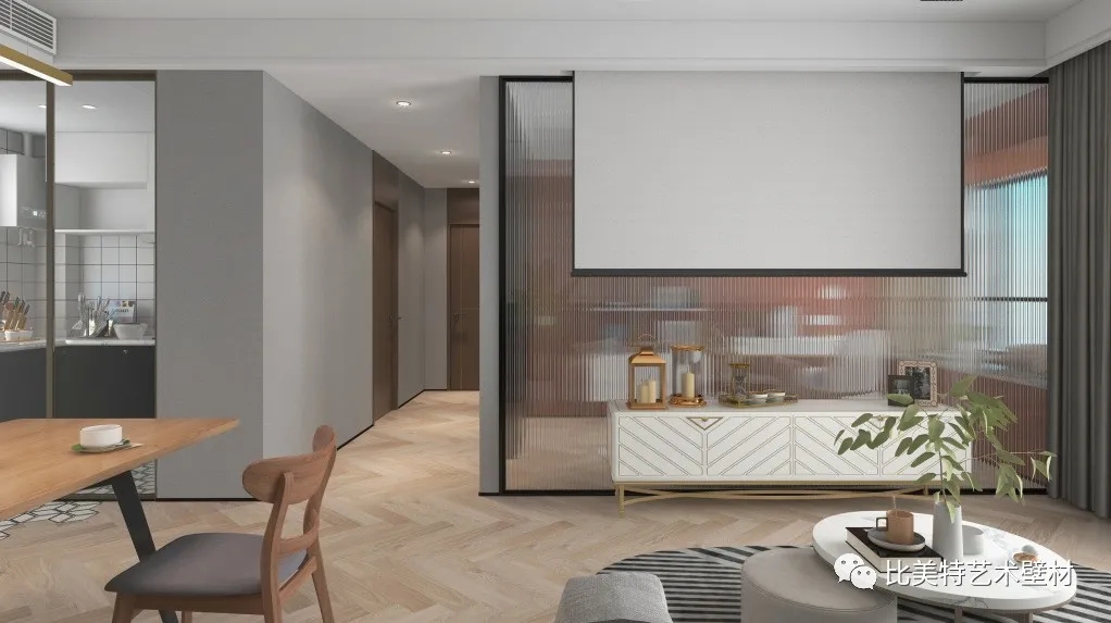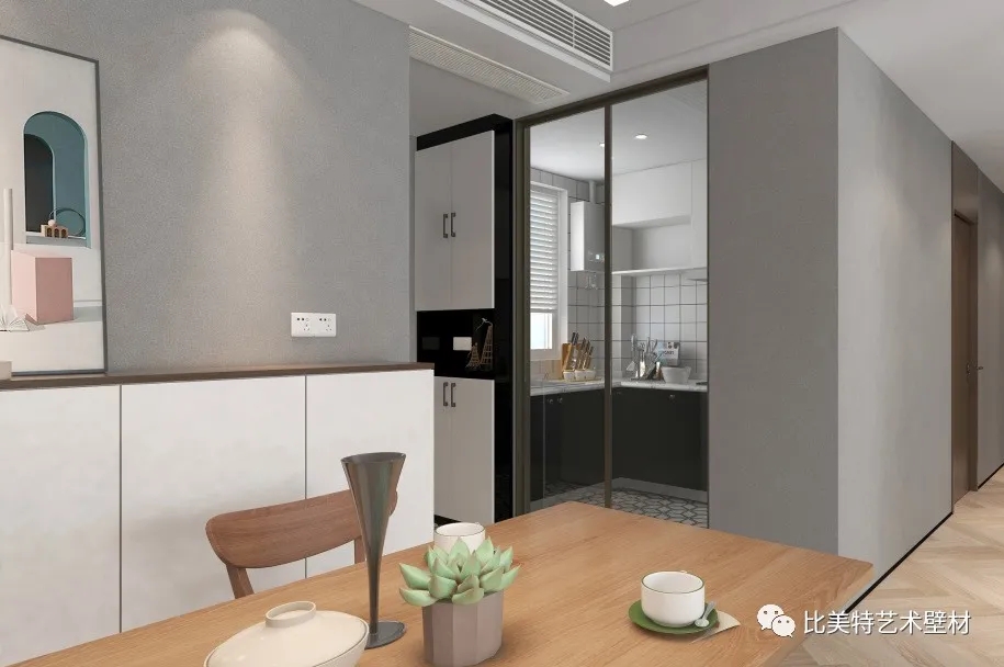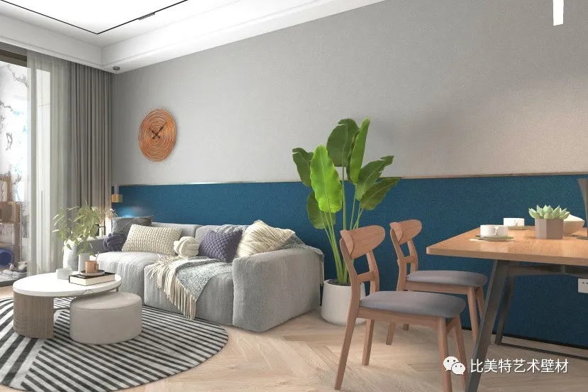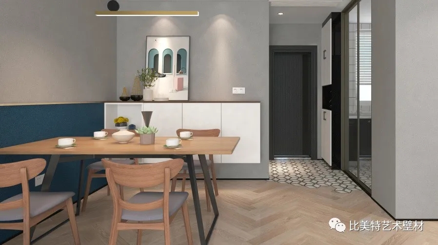 设计理念:本案整体风格为北欧混搭,墙面采用比美特艺术壁材克瑞斯系列净素工艺,轻奢含蓄的磨砂纹理,纯色素雅的色彩,在灯光的照射下,闪耀着点点光泽。搭配简约优雅的北欧风,很好的诠释了质与感并存的自由家居。