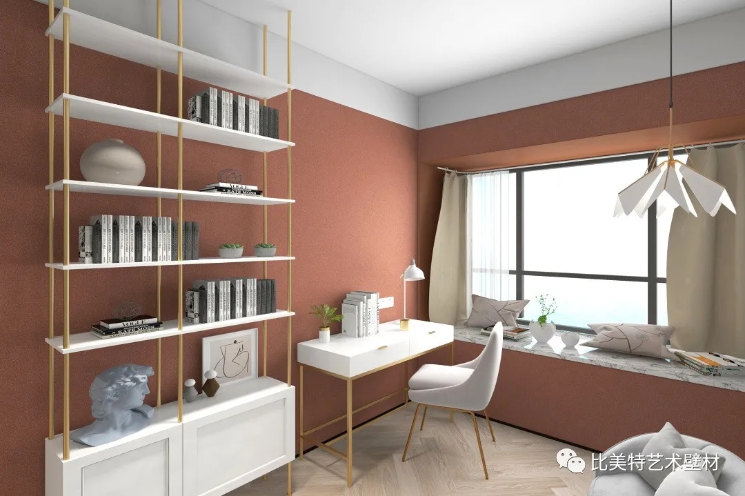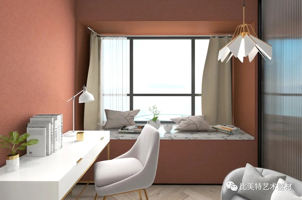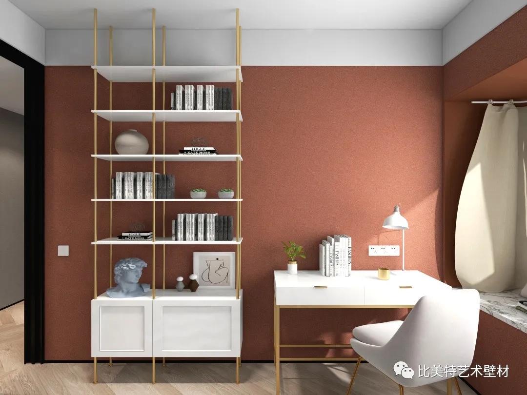 书房空间背景墙则选用克瑞斯的暖棕色,并以白色家具提亮空间,让书房空间笼罩在温柔静谧之中。在都市快节奏的生活中,这样有格调有温度的设计,或许更适合我们安放抚慰我们浮躁的内心。