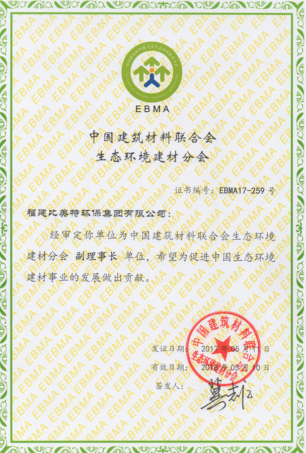 6月18日,由中国建筑材料联合会生态环境建材分会、中国质量认证中心等主办,福建比美特环保集团有限公司等联合承办的生态建材质量认证体系发布会暨质量认证启动仪式在上海举行。
